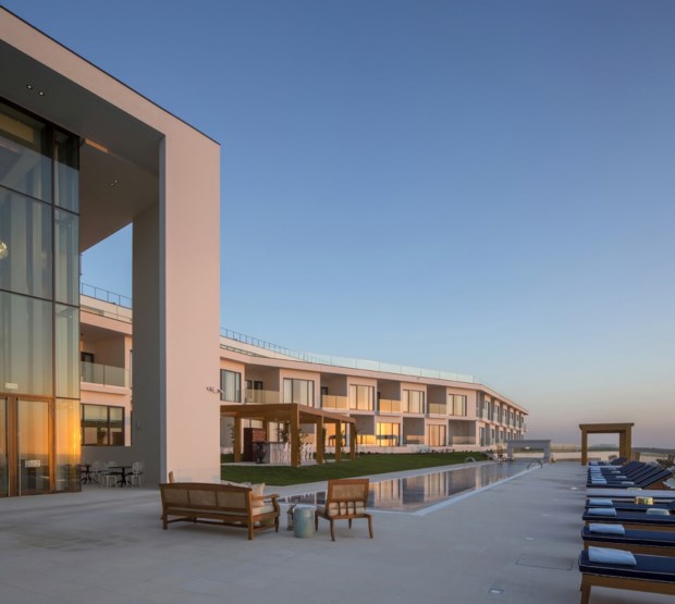 "Vistas panorâmicas para o Oceano Atlântico e golfe ou para a Lagoa de Óbidos". A "imponência das áreas comuns", o "design arrojado e inovador".