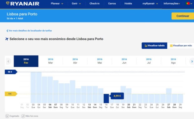 A companhia aérea Ryanair voltou a disponibilizar voos entre o Porto e Lisboa ao preço mínimo: 4,99 euros - o valor esteve disponível até ao final da tarde de quarta-feira, tendo entretanto passado para "desde 7,99 euros". É um preço por trajecto que surge no site da empresa para viagens em Fevereiro (no caso dos 8 euros surge já noutros meses). Os preços mínimos passam depois a 9,99 euros e 14,99 euros. Claro que, como sempre, o trabalho maior - além de encontrar passagens disponíveis já que normalmente desaparecem rapidamente - é conjugar uma ida e uma volta a bons preços.
