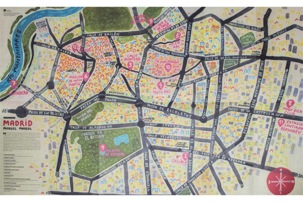 No livro-mapa de Madrid, o ilustrador Manuel Marsol, nascido na cidade, foca-se no Palácio de Cristal, na Livraria Panta Rhei, no Mercado de Antón Martín e no Matadero, entre outras referências da capital espanhola. Marsol "mostra-nos uma forma muito pessoal de conhecer a sua cidade", lê-se na apresentação do livro. "Passeia com Manuel pelo bairro Malasaña; bebe um copo na Taberna Cazorla; visita a livraria Panta Rhei e o Museu ABC dedicado exclusivamente a ilustração e desenho. Antes que o dia acabe, aproveita o pôr-do-sol no Templo de Debod."
