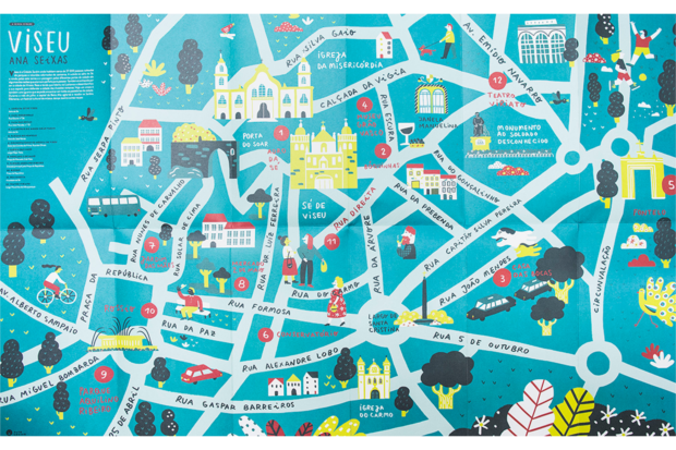 Comecemos por Portugal. Viseu é a "cidade jardim", das "sete torres", a "capital da Beira Alta", ilustrada e descrita por Ana Seixas. É a casa de cerca de 27.000 pessoas, "rodeadas de parques e rotundas adornadas de canteiros", e foi lá que Ana nasceu. "Como já não vivo em Viseu há alguns anos, foi como uma viagem", confessou a ilustradora ao P3. Vários fins-de-semana passados na sua cidade natal e uma sensação de nostalgia constante resultaram neste livro. "Tive de ver a cidade com outros olhos, reparar nos pormenores, olhar com atenção."