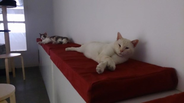 Por aqui, “Valentino”, “Bowie”, “Vida” ou “Roco” passeiam-se por onde bem lhes apetece, preguiçam nas suas camas, passam o tempo entre brinquedos, labirintos, arranhadores ou a caçar festas dos clientes. A casa reparte-se por dois pisos, convenientemente decorados com fotos e pinturas relacionadas com os mundos dos gatos, num ambiente relaxante entre sofás, cadeirões e almofadões. Para os moradores, há comida e água sempre à disposição. Para os visitantes, há serviço de bebidas (não-alcoólicas, entre cafés, sumos naturais, chás, etc.), livros ou Internet sem fios gratuita.