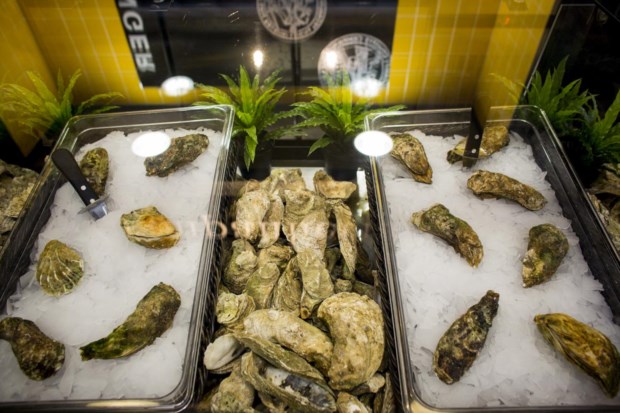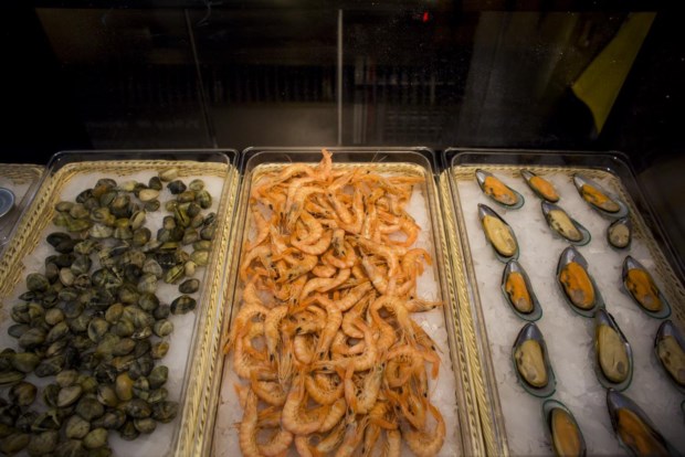 É um em dois. O espaço do Mercado do Marisco (que está ligado ao restaurante Porto de Santa Maria, no Guincho, embora seja uma marca diferente) divide-se em duas áreas, uma de “produtos mais nobres”, como explica Constança Homem de Melo, a responsável pela loja, onde se podem comer ostras e beber champanhe (os outros espaços do mercado não podem vender bebidas, que devem ser compradas nos espaços do café ou da garrafeira), e outra em que há marisco em versões mais económicas, dos percebes aos mexilhões, passando pelo camarão (de momento não há camarão de Espinho por causa do defeso, mas assim que existir vai estar à venda aqui).