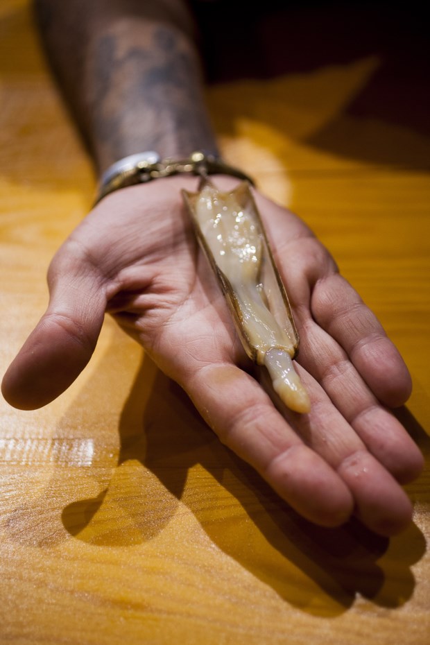 Para Hugo Brito, do restaurante Boi-Cavalo, em Alfama, é a estreia absoluta no Peixe em Lisboa e para ela criou até t-shirts que toda a equipa veste, negras com letras a cor-de-rosa em que o Boi abandona o cavalo e passa a emparelhar com a cavala, como se impõe num festival de peixe. Entre os muito pratos que tem – entre os quais um dos maiores sucessos do festival, as pipocas de lula, picantes e com um molho de tinta de choco –, escolhe o lingueirão, um marisco que gosta de trabalhar, com uma carne bem estruturada e que aguenta sabores fortes como os que aqui usa: miso e beterraba (porque o lingueirão, apesar de vir do mar, integra-se bem com sabores muito ligados à terra, como é a beterraba), terminando com trigo-sarraceno para lhe dar o toque crocante.
