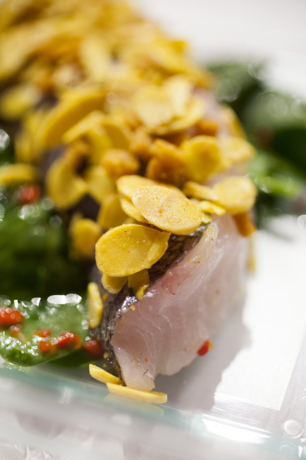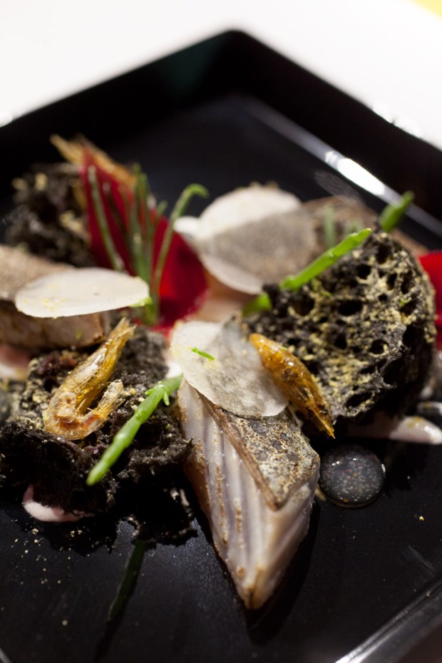Outro restaurante com estrela Michelin presente no Peixe em Lisboa é o Arola, do Penha Longa Resort. Não é o chef catalão Sergi Arola que encontramos no espaço (embora tenha vindo ao festival fazer uma apresentação da sua cozinha), mas sim o seu braço direito em Portugal, Milton Anes. E é ele quem escolhe o prato e o produto que quer destacar: a pescada de anzol com espinafres, caril e amêndoas. Já na edição do ano passado este prato foi um dos maiores sucessos do Arola e Milton orgulha-se da simplicidade de sabores que aqui apresenta. Longe da ideia de que a pescada é um peixe para quem está doente, esta destaca-se por um lado por ser de anzol e por outro pela delicadeza com que é cozinhada, que a deixa com uma textura extraordinária. Não é um peixe que aguente sabores demasiado intensos ao lado, mas os acompanhamentos aqui estão ao serviço da pescada e com um resultado surpreendente.