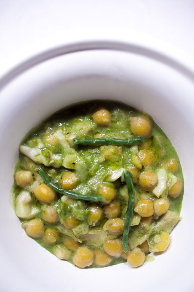 Apesar de muita gente vir ao espaço da Taberna da Rua das Flores para as já célebres pataniscas e para outro dos best-sellers deste ano, o bao de caranguejo de casca mole, o prato que André Magalhães destaca é o Tripas Mar e Monte, em que junta dobrada com grão pequeno, português, e o sames, que é a bexiga natatória do bacalhau, uma parte do peixe que os portugueses sempre souberam aproveitar e que tem, explica André, imenso colagénio, o que acrescenta ao prato um saboroso lado gelatinoso. É um ingrediente que gosta de trabalhar precisamente pela forma como se integra facilmente num prato de carne e por essa gelatina natural. Além disso, acrescenta, o sames é um órgão fascinante, que pode expandir-se e contrair-se, ajudando o bacalhau a manter-se em profundidade ou a nadar para cima.