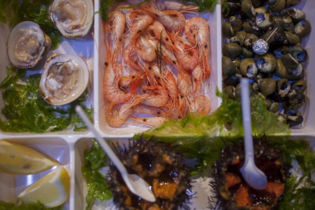 Ao chegarmos ao último espaço de restauração, o Ribamar de Helder Chagas (o único que esteve presente no Peixe em Lisboa ininterruptamente desde a primeira edição), encontramos o mar na sua maior simplicidade. Helder nem hesita quando lhe pedimos que escolha um prato. Aquele que sugere está à sua frente e foi baptizado como Prazeres de Tróia. Cheira a mar e foi isso precisamente que Helder quis trazer para o centro de Lisboa – o cheiro a mar dos melhores produtos que serve nos seus restaurantes (Sesimbra e Tróia). Explica que com produtos tão frescos, o mais inteligente a fazer é servi-los na sua pureza e não tentar transformá-los com cozinhados complicados. Assim, temos ouriços (todos os anos há uma corrida dos ouriços do Ribamar durante o festival), pés-de-burro, burriés e camarão da costa.