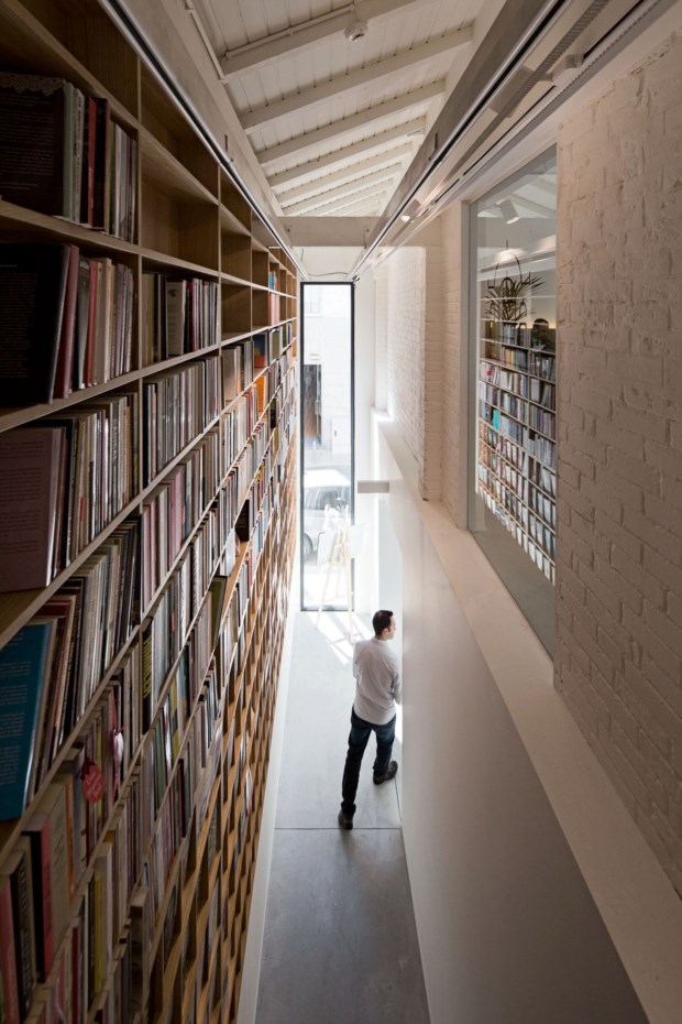 A fachada do edifício capta a atenção dos passantes pela luminosidade que vem do interior. As amplas montras carregadas de livros sugerem, à primeira vista, um outro tipo de negócio, mas, transposta a ampla porta de entrada, o cenário é de apelativo ambiente de degustação. A estilizada garrafeira vertical, a cozinha em fundo e as mesas postas com baixela cuidada não deixam margem para mais dúvidas.