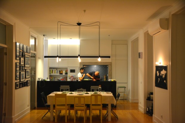 E sobre o que se conversa com estranhos? António e João fazem as honras da casa e ao longo da refeição vão contando as suas histórias. Quando eles não estão, seguimos o mesmo guião: conversamos sobre viagens inspirados pelo planisfério que decora a sala e que mostra os países por onde o anfitrião já passou e as dezenas de guias de viagens que estão empilhados ao fundo da divisão. Se não, podemos sempre falar de comida ou de vinhos.