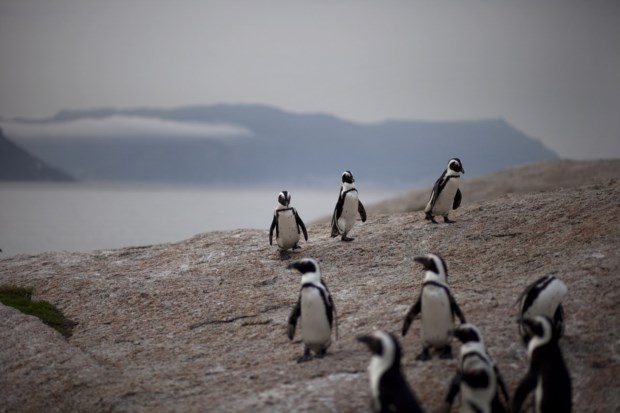 Os pinguins ficam a meio caminho, em Simon’s Town, mais concretamente na colónia de Boulders. Estaciona-se o carro num parque, e a partir daí os visitantes têm o Willis Walk, um passadiço de madeira pelo meio da natureza que bordeja pequenas baías cheias de calhaus e refúgios. E cá estão os primeiros pinguins, com aquele andar de pé chato, para a direita e para a esquerda. Caminham entre o que parecem botijas de gás enterradas na areia com números, mas na verdade são ninhos. E mais adiante, no fim do passadiço, cá estão eles, agora às dezenas, em cima das rochas, curvados para o mar, e a mergulhar. São Pinguins Africanos. Distinguem-se por terem uma lista negra em curva no peito.
