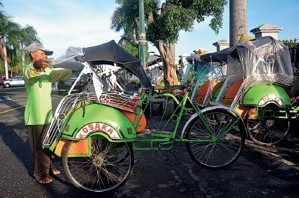 A menos de meia hora de estrada, um lugar bem mais mundano: Yogyakarta, a base ideal para explorar a região. Fatigados de tanto calcorrear – só em Borobudur, a peregrinação até ao nirvana consome cinco quilómetros de sola de borracha – refastelámo-nos numa colorida becak, o riquexó local de tracção humana e zero emissões de CO2. Os laranjas acastanhados agrupam-se no horizonte conjecturando uma rápida saída de cena do astro-rei, pelo que este era o meio mais rápido e, sobretudo, prático para uma incursão pela sede ancestral da cultura javanesa e capital cultural da Indonésia, onde as artes e as tradições são mais fortes. Aqui descubro um palácio de um sultão, o Kraton, que ainda hoje é habitado pelo último sucessor, preservando o título de príncipe da cidade. Ainda dentro do palácio, vou a tempo de assistir, de passagem, a um espectáculo tradicional de música e teatro de sombras.