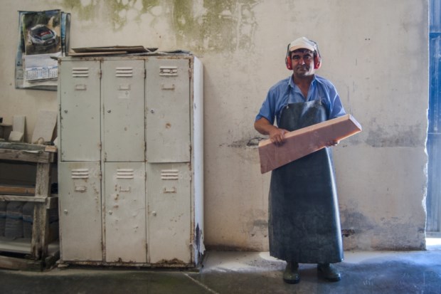 Um dia de trabalho aqui muda “quase de minuto a minuto”, conta, e há dias em que, em determinado piso, as temperaturas rondam os 50 graus centígrados. Há poeiras, vento. Voltam a repetir-nos que tivemos sorte com a temperatura. Numa fábrica é diferente, o serviço é mais mecânico – se bem que, daquilo que se retira da pedreira, só se consegue transformar entre 6 a 12%, diz Luís Sotto-Mayor, da fábrica Marmetal. Aqui na pedreira, o corte com fio de diamante depende da pedra. É preciso perceber até onde se pode furar, coordenar os serviços das máquinas. “É o que nos rouba mais tempo”, lamenta o senhor Lobinho.