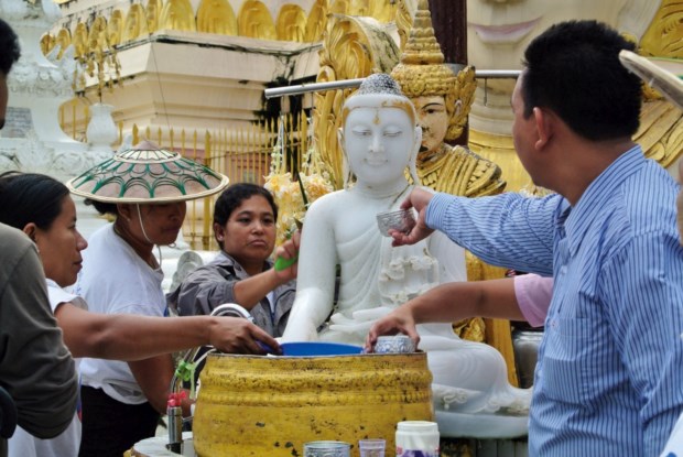 O mais espectacular de Rangum é o célebre pagode, em torno do qual os pescadores criaram a cidade, segundo a lenda dos dois irmãos mercadores que trouxeram até aqui os oito cabelos que tinham pedido ao Buda Siddartha Gantama, num cofre de esmeraldas. No pagode recolhem-se as relíquias do Buda, as cinzas de outros três veneráveis Budas e os monumentos funerários de Supayalat, última Rainha da Birmânia (1859-1925), de Daw Khin Kyi, mulher do herói da independência Aung San e mãe da Aung San Suu Kyi, Prémio Nobel da Paz, bem como de U Thant, antigo Secretário-Geral das Nações Unidas. O zedi ou stupa, imponente cone dourado, atinge 98 metros de altura e a base é feita de tijolos cobertos com placas de ouro, sendo rodeado de 64 pagodes pequenos. Na flecha principal estão penduradas 1500 sinetas de ouro e prata… É o budismo theravada que domina em Birmânia, cujos monges têm tido um papel muito importante da defesa da cultura e da abertura.