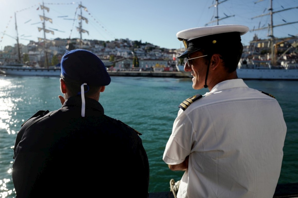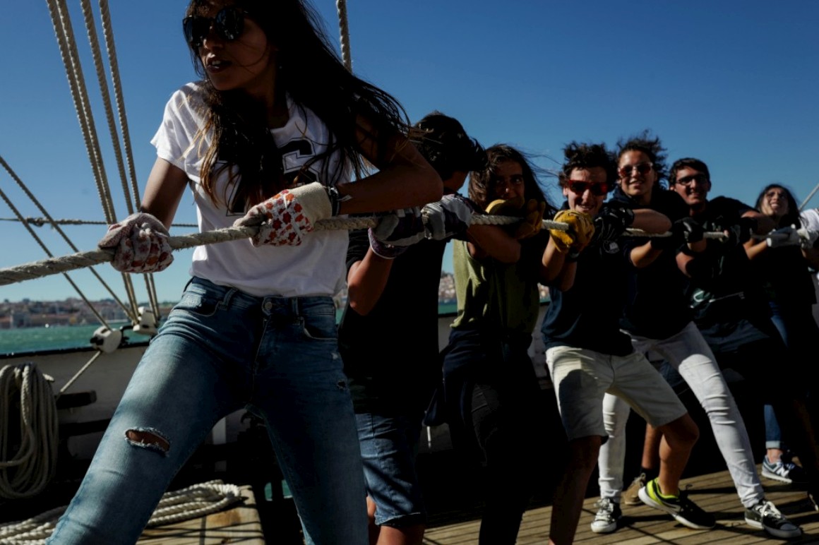 O branco do uniforme dos marinheiros distingue a tripulação dos aprendizes. A acompanhar os 40 militares da Marinha Portuguesa está um grupo de 35 instruendos, jovens com idades entre os 14 e os 18 anos. Mas a distinção termina aqui. Integrado nas tarefas requeridas a qualquer velejador profissional, o grupo presta apoio à tripulação oficial. “Não atrapalham nada, até nos ajudam bastante”, garante Carvalho de Oliveira, comandante do veleiro, depois de garantir que a recolha das velas está a ser bem executada e que a aproximação à costa reúne todas as condições de segurança.