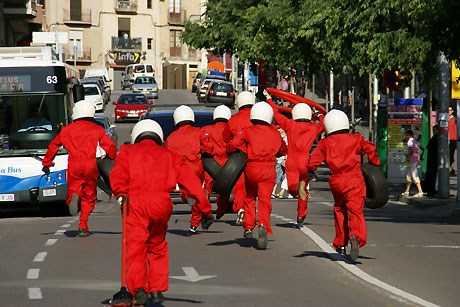 Uma rua transforma-se numa box de Fórmula 1 de um qualquer autódromo imaginado. Cai o vermelho no semáforo e os “mecânicos-actores” aproximam-se do carro mais perto para fazer o seu trabalho, com eficácia e rapidez.
