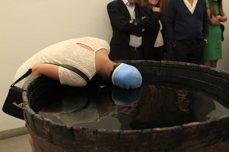 Logo à entrada, o espectador é convidado a meter a orelha na água para ouvir um poema, num desafio aos sentidos e à percepção do público.