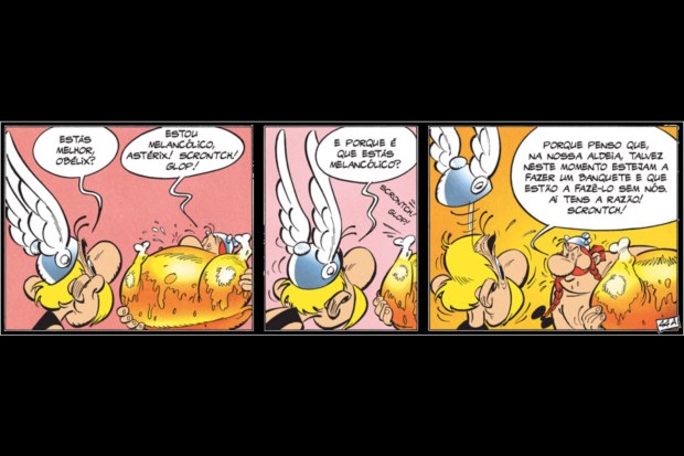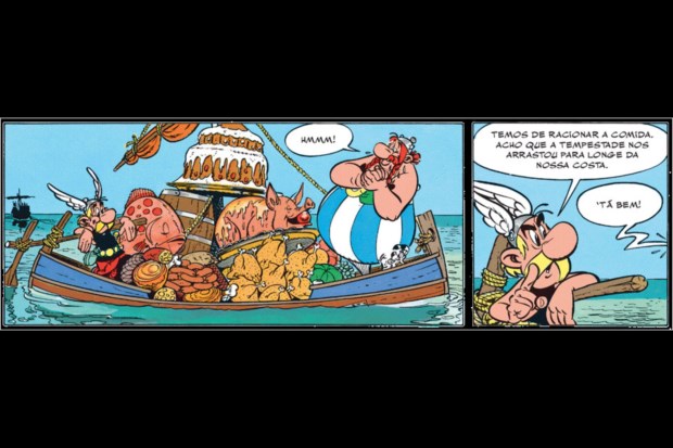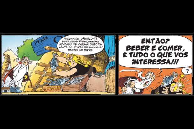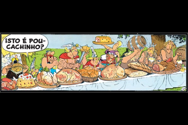 O problema é que, como sabemos, os atletas devem evitar excessos alimentares - e os espartanos são disso um bom exemplo, alimentando-se apenas de "figos, azeitonas, carne crua e água" (ou, na versão de um atleta revoltado, "caroços de azeitona e banha"), enquanto os gauleses se banqueteiam com tudo o que há de mais saboroso.