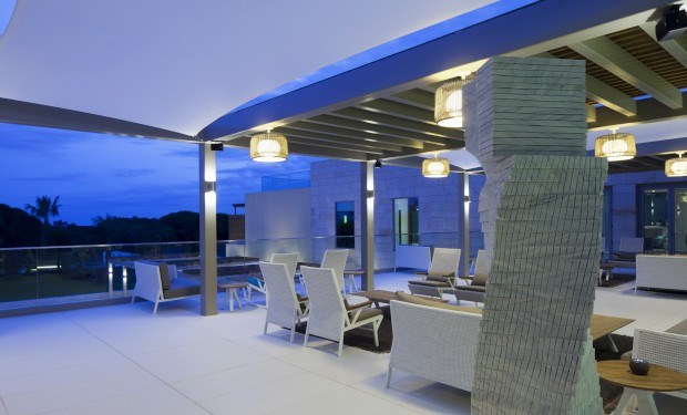 Assim que se põe um pé neste hotel, junto à Praia da Falésia, Albufeira, no Barlavento algarvio, os olhos ficam postos no mar que, ao longe, desenha o horizonte. O vidro, a forrar toda a lateral Sul, do chão ao tecto, forma uma espécie de tela na qual o verde das copas das árvores, o avermelhado da falésia e o azul do mar se misturam numa imagem que se repete por quase todas as áreas da unidade.