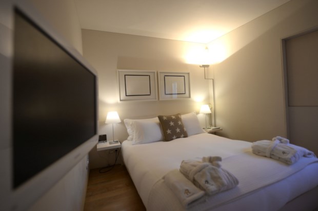 Primeiro aspecto a considerar quanto a este loft: não tem janelas. Pode parecer uma descrição pouco apelativa, mas a verdade é que a grande clarabóia e a porta com vidro fosco impedem que isto se transforme num ponto negativo. Mesa e cadeiras à entrada, dois pequenos sofás, uma estante de inspiração nórdica e muita luz indirecta. Ao fundo, a cama que Souto de Moura desenhou, e muito branco: nos têxteis, nas paredes, no iMac que funciona como televisão e computador, à disposição. É tudo claro, luminoso e, acima de tudo, confortável. Agora que aqui estamos até agradecemos a chuva: só aumenta a sensação de conforto. Para desfrutar do pormenor que distingue este quarto, o melhor é deixar-se cair na cama e pegar no comando arredondado que repousa na mesinha de cabeceira; depois só tem de abrir o estore da clarabóia — design exclusivo de Souto de Moura e concretização única para o Sky Loft — e ver o céu sem ter de levantar a cabeça. De manhã, basta fazer o mesmo e deixar entrar a luz da Foz Velha. Se quiser banda sonora, aproveite a playlist disponível nos computadores e tablets dos quartos ou a dock que permite a ligação de iPod ou iPhone.