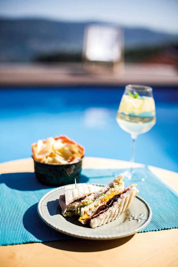 Para entrada, tarteletes de alho francês e umas tão simples quanto deliciosas espetadas mediterrânicas: tomate cherry, presunto, manjericão e mozarela com vinagreta e orégãos. Avança-se depois para uma tosta de broa de milho com chouriça e maçã e logo a seguir para um bacalhau à Brás (com as batatas a chegarem fritas às rodelas) que se apresenta delicioso. O pão-de-ló com coulis de frutos silvestres e flor de poejo (antes do jantar, vimos Vasco a colhê-lo de um canteiro – as ervas aromáticas têm grande destaque na gastronomia de Lígia e aqui estão literalmente à mão de semear) poderia muito bem ter sido a cereja no topo da refeição. Mas deu-se o caso de termos provado, ainda, um licor de especiarias que Lígia engarrafou há um ano e meio e se revelou numa explosão de sabores memorável.
