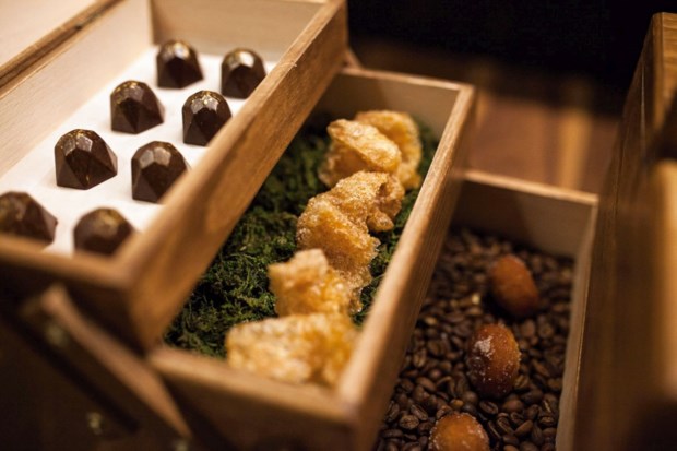 “Em vez de usarmos temperatura, que faz desaparecer os aromas, reduzimos a frio no alambique a vácuo”, explica Alexandre. “Levamos a colher à boca e é muito intenso, mas como leva chalota crua picada, tomate cru, o mexilhão é aberto com vinho branco, leva um pouco de malagueta, depois do doce começa a vir tudo o resto, a chalota, o vinho, o mexilhão, com uma enorme intensidade. E fica tudo equilibrado.”