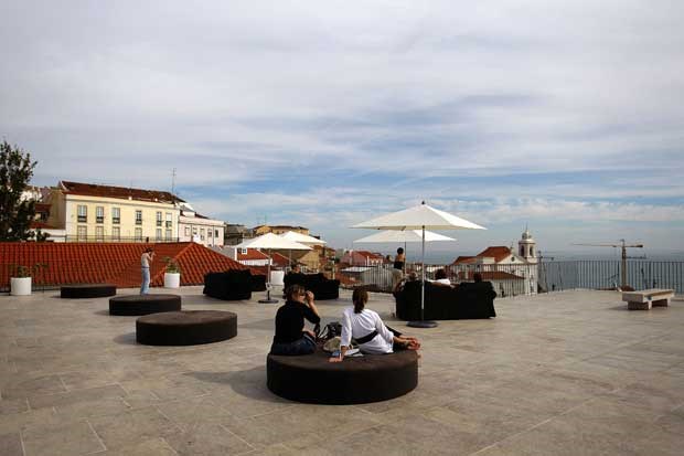 Convenhamos, é clímax para turista, olisiponense ou qualquer amante de Lisboa. Por estes lados, aliás, já tínhamos altaneiro observatório infinito, algumas esplanadas simples e sem brilho com a devida excepção para a clássica Cerca Moura. Não tínhamos era o que temos agora, a nova Esplanada das Portas do Sol, uma plateia deluxe de olhos fincados no rio que, não havendo chuva à vista, até oferece o prazer de nos esparramarmos em confortáveis e grandes sofás à beirinha, bem à beirinha da boca de cena. Ou em "puffs" e afins. Ou, mais condignamente, nas clássicas cadeiras portuguesas de esplanada (as cadeiras Gonçalo), aqui todas branquinhas-branquinhas sem mácula publicitária ou variação plasticizada.