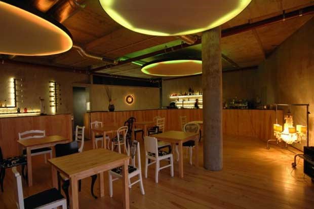 E aqui chegados: uma esplanada que abre também no Outono/Inverno? Com o frio, a chuva? Sim, é que, claro, há mais: este é o grande terraço de um grande salão, de portadas e janelões de vidro, protegido das inclemências do clima e de devaneios, passada a uma decoração minimalista em tons pretos e brancos, com madeira clarinha, grandes candeeiros redondos de tecto com iluminação LED (que alternam subtis variações cromáticas), candelabros de cristal em "charriots" andarilhos, um balcão de bar que impõe respeito e armadilhado com originais cadeiras todas recicladas e reinventadas e nenhuma igual à outra.